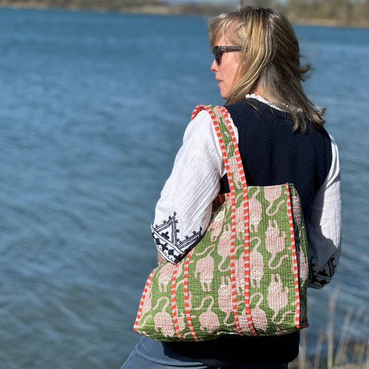 A colourful range of beautiful block print tote bags and larger.