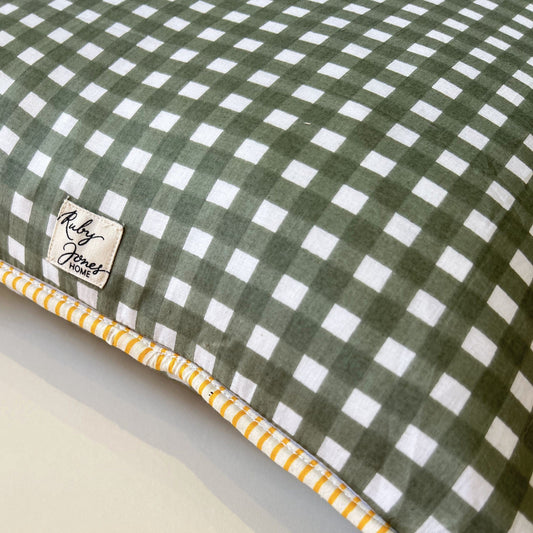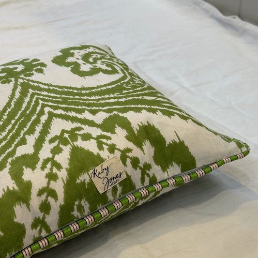 Cushion - Pea Green on Ikat with Green stripe Piping