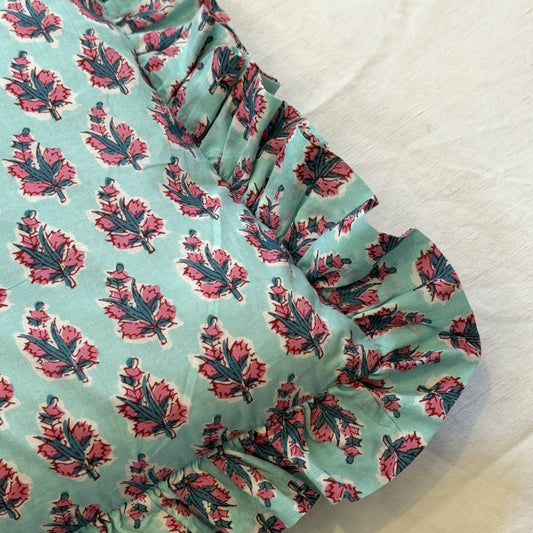 Cushion - Pink Flowers on Turquoise with matching Ruffle